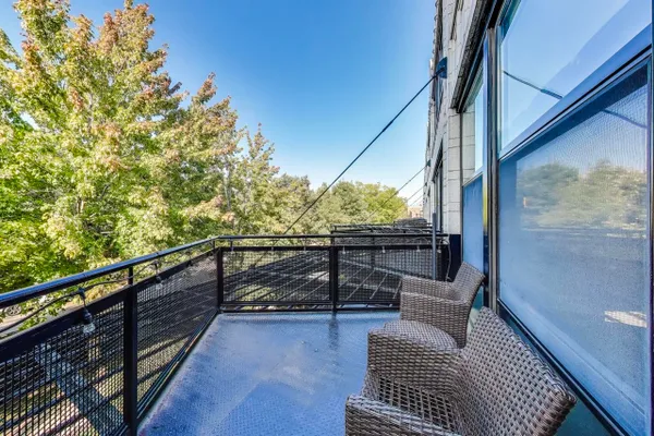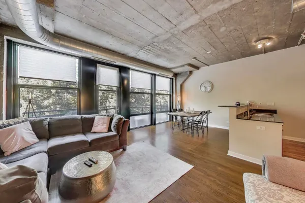 Fabulous 2-Bed/2-Bath Concrete Loft in Popular University Commons! Expect to be impressed by this sought-after split-bedroom floor plan featuring soaring 12' concrete ceilings, expansive north-facing floor-to-ceiling windows with beautiful treetop views, and generous living spaces. The wide living area includes hardwood floors, a cozy gas fireplace, space for a full-size dining table, and access to your private balcony. The open kitchen boasts 42" cherry-stained maple cabinetry, granite countertops with breakfast bar seating, and stainless steel appliances-perfect for entertaining. The spacious primary suite offers large closets and a private ensuite bath. The versatile second bedroom makes an ideal guest space or home office. In-unit laundry. Attached, garage parking available for an additional fee. University Commons is a vibrant community offering resort-style amenities: outdoor pool and sundeck, penthouse-level fitness center, rooftop deck with panoramic skyline views, party room, theater room, and even organized community activities like kids' club and book club. Enjoy the neighborhood feel of this quiet, tree-lined enclave while still being minutes from everywhere-walk to Pilsen's 18th Street corridor, and enjoy easy access to the West Loop, Little Italy, South Loop, UIC, the Medical District, Greek Town, and Chinatown. Pet- and investor-friendly building with strong rental demand. Investors: current month-to-month tenant is interested in signing a long-term lease.