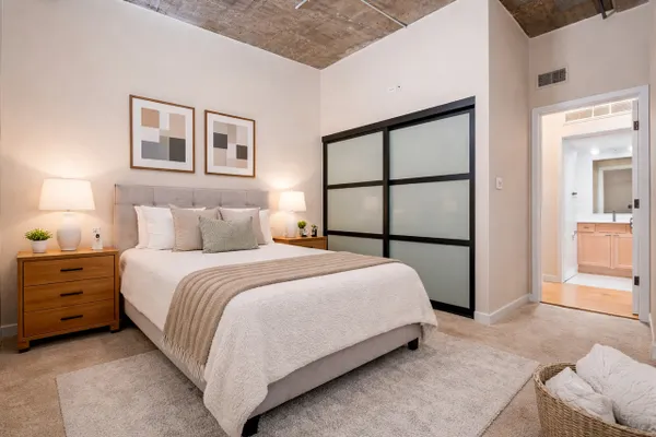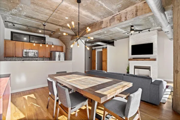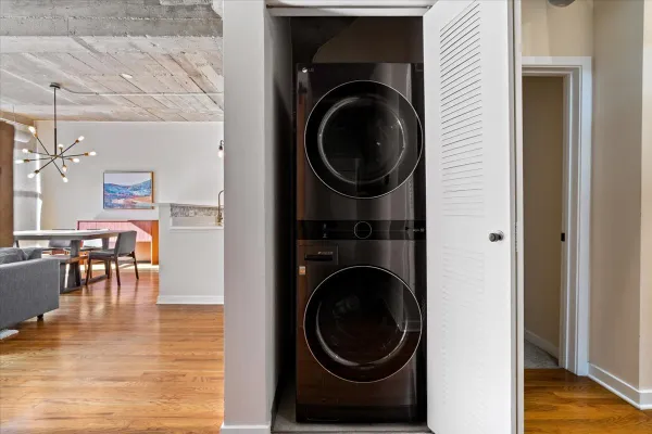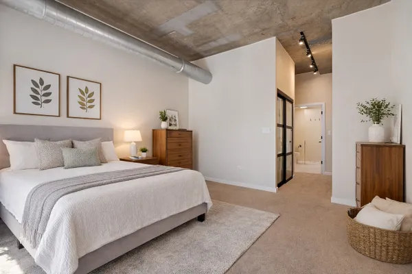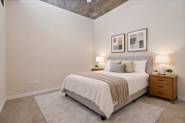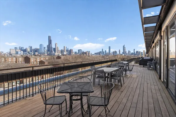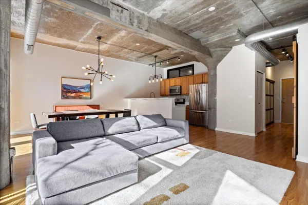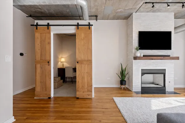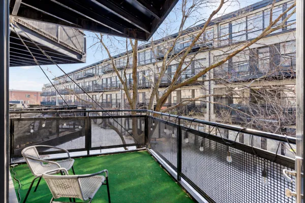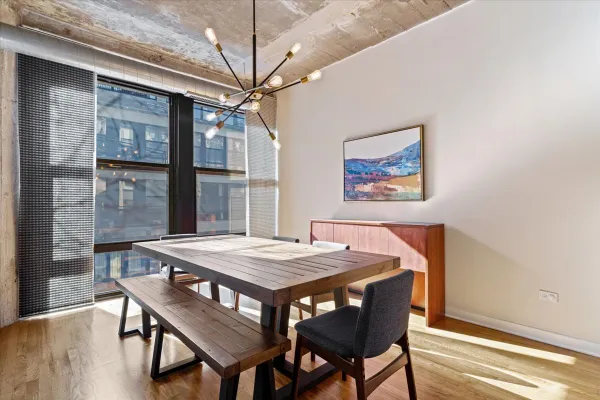 Welcome to the beautiful University Commons community! This 2-bedroom, 2-bathroom, south-facing unit features one of the most desirable layouts in the building. It offers loft-style living while also providing privacy, with both bedrooms being fully enclosed. The sun-drenched unit has floor-to-ceiling windows, filling the home with abundant natural light throughout. The open-concept living space, separate dining area, and kitchen create a seamless flow for everyday living and effortless entertaining. Kitchen features stainless steel appliances and quartz countertops. Recently refinished hardwood floors throughout the living space and warm-toned walls throughout the entire unit provide warmth and comfort. Right off the living area, you'll find a huge private balcony facing the courtyard, ideal for morning coffee or evening relaxation. A additional space just off the living room serves as a private office, complete with a sliding barn door and built-in desk - perfect for working or studying from home. The primary bedroom features an en-suite bathroom and generous closet space, comfortably accommodating a king-size bed. The second bedroom is also sizable, easily fitting a queen-size bed. Newer, in-unit washer/dryer (2025). Additional storage included. The professionally managed association offers exceptional amenities, including an outdoor pool, fitness center, theater room, sundeck, and party room with city views. Conveniently located near the highway, UIC, the Loop, Pilsen, Greektown, and the West Loop, you'll enjoy easy access to top dining, shopping, and public transportation. While this unit does not come with parking, there is an option to rent or purchase a parking space from another owner in the building. Schedule your private tour today!